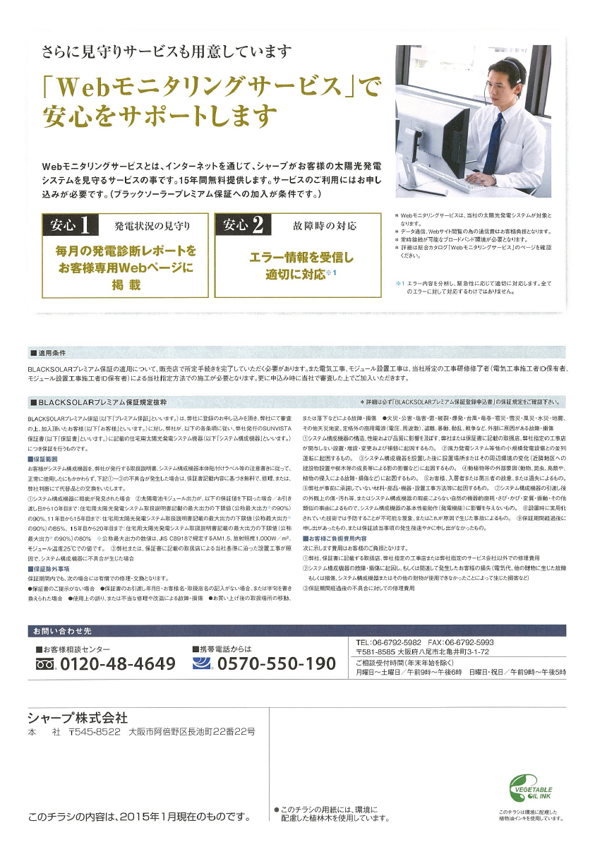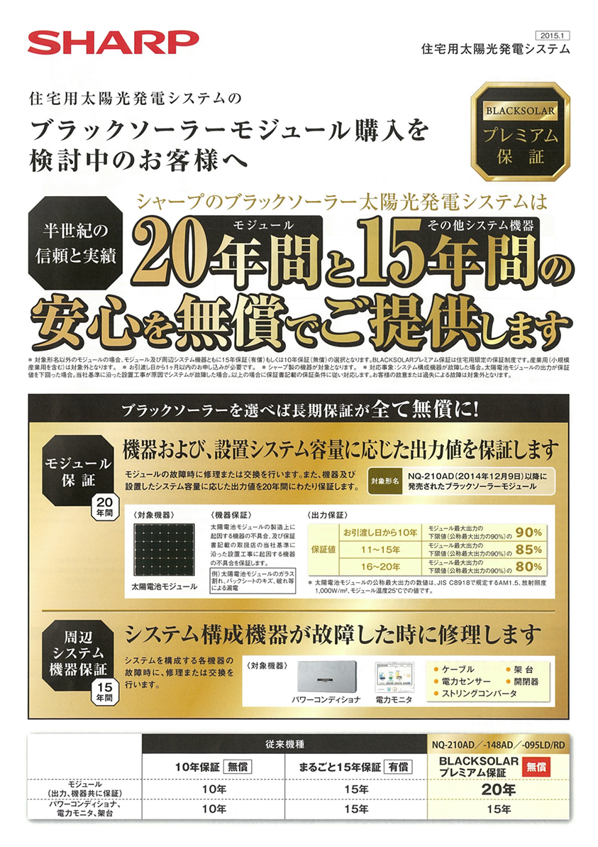 シャープのブラックソーラー太陽光発電システムは、モジュール『20年間』とその他システム機器『15年間』の安心を無償でご提供します。