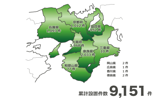 髙嶋電気工事は近畿地区で、太陽光発電システムの設計・設置をこれまでに9,151件行ってきました。